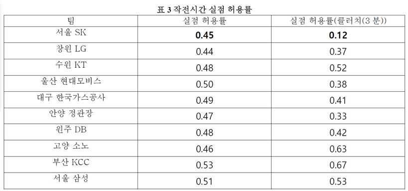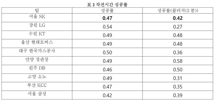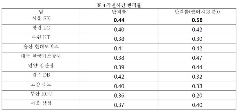작전 시간의 실점 허용률과 반격률로 살펴보면 SK는 경기 승패가 결정되는 클러치 상황에서 상대방이 부른 작전 타임을 수비해내면서 먼저 득점까지하는 강한 집중력을 보였고 정규리그를 우승할 수 있었다.