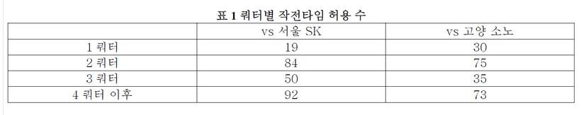 소노를 상대하는 팀들은 전반전(1, 2쿼터)에 30회, 75회를 후반전(3, 4쿼터)에는 35회, 73회의 작전 시간을 불렀는데, SK를 상대로는 전반전(1, 2쿼터) 각각 19회, 84회, 후반전에 50회, 92회 사용했다.