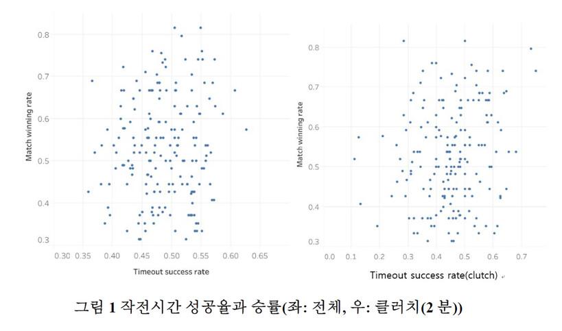 그림1의 작전시간 성공율과 경기 승률의 산점도를 보면 두 가지 요소는 크게 관련 있어 보이지 않는다.