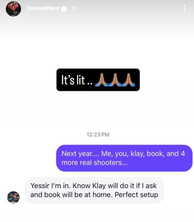 릴라드는 "내년에 나와 커리, 데빈 부커, 클레이 탐슨과 4명의 슈터를 추가해 3점 콘테스트를 펼치자!"라고 말했고, 커리는 "좋아! 탐슨도 내가 물어보면 참여할 거고, 부커도 홈에서 열리는 경기이기 때문에 출전할 거야. 완벽한 명단이다"라고 답했다.