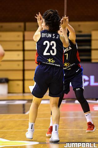 10일 헝가리 데브레첸 올라가보르 스포츠홀에서 열린 '2021 FIBA U19 여자농구월드컵' 한국과 브라질의 조별 예선 3차전 경기, 변소정이 조수아와 하이파이브를 하고 있다.