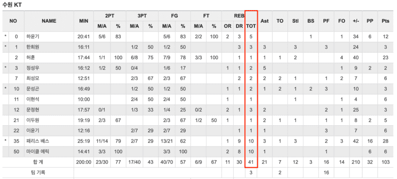 외국선수인 배스와 마이클 에릭은 각각 10리바운드를 잡아냈고 이외에 허훈, 이현석, 이윤기, 이두원이 1개 이상씩을 기록하며 빈틈 없는 KT 리바운드 기록지가 완성됐다.