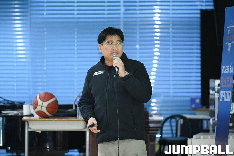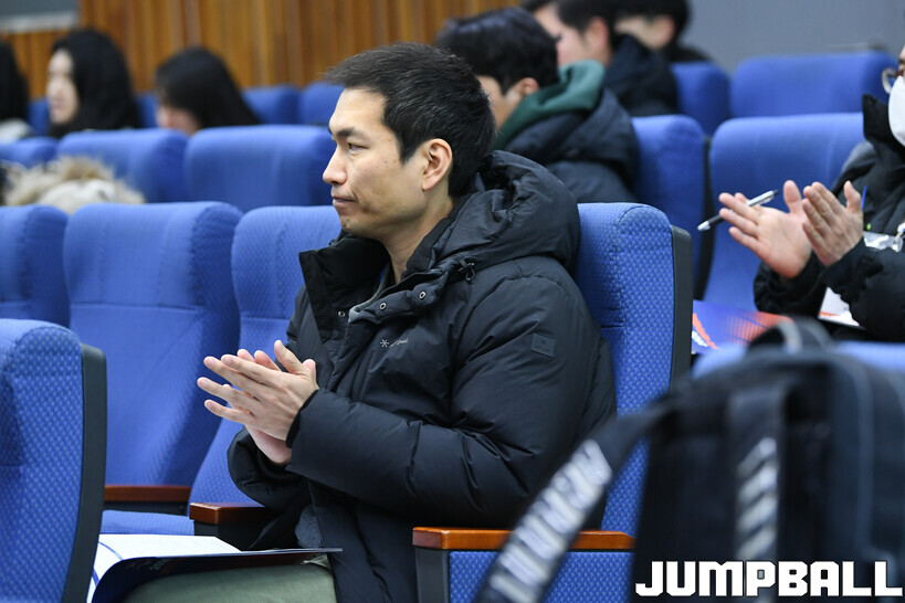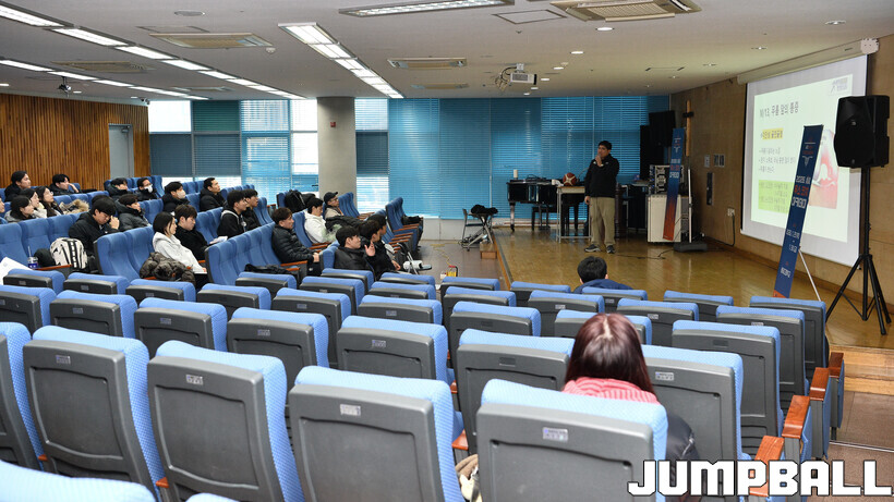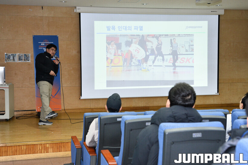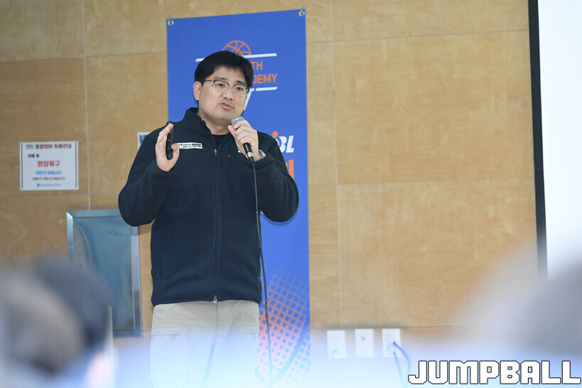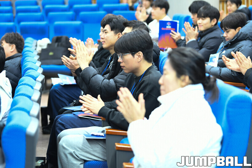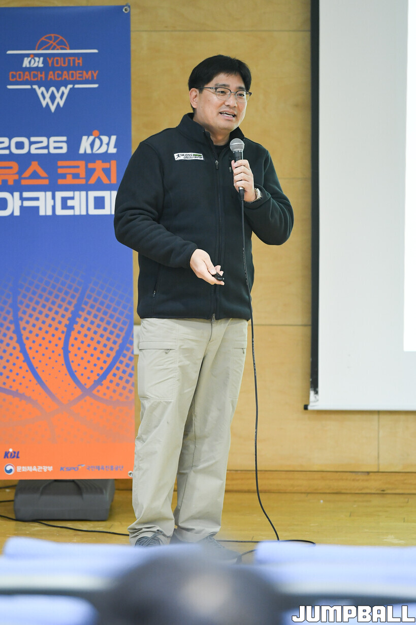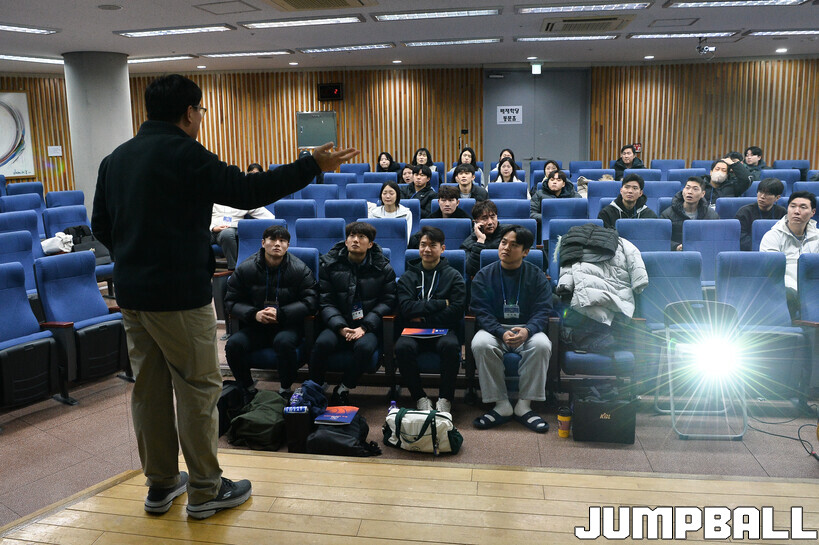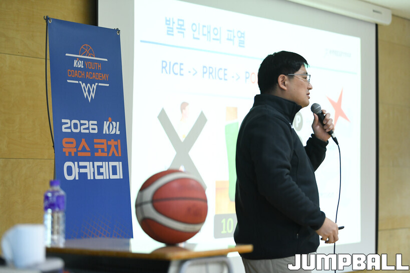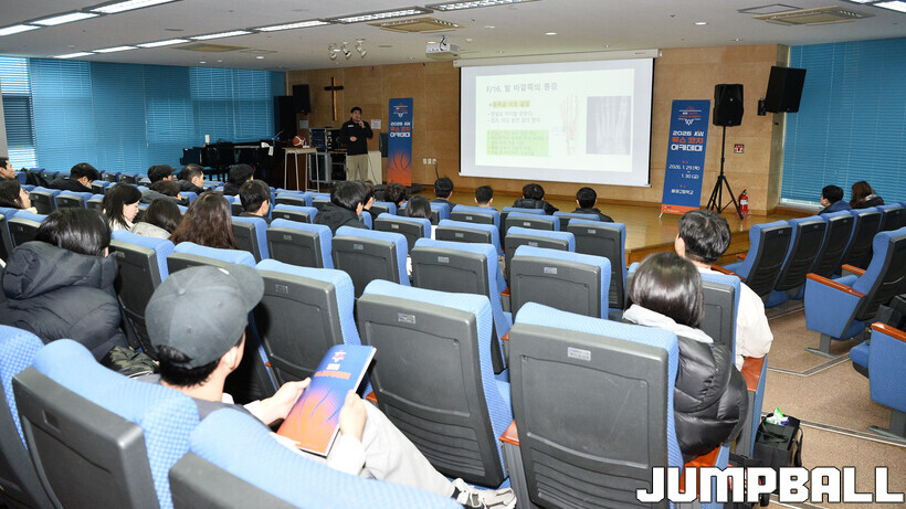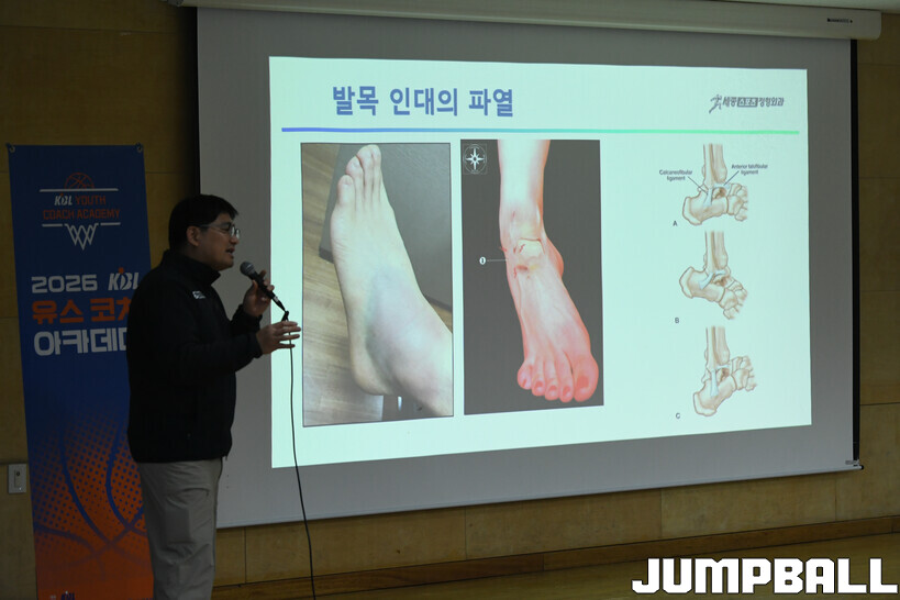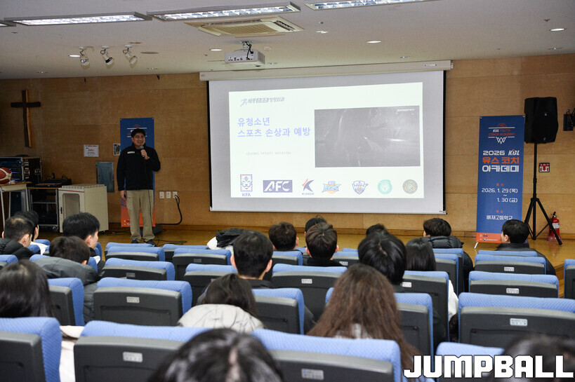 [점프볼=고덕/유용우 기자] 29일 배재고 체육관에서 2026 KBL 유스 코치아카데미 1기 1일차가 실시됐다. 오전 교육으로 세종스포츠정형외과 차민석 원장이 스포츠 손상 예방교육을 진행했다. KBL은 일반 학교 및 유소년 농구 현장에서 활동 중인 교사와 지도자들에게 전문적인 교육을 제공, 코칭 역량과 지도력을 향상시키는 것을 목적으로 KBL 유스 코치아카데미를 신설했다. 1기 아카데미에 선발된 40명의 교사들은 첫날 스포츠 손상 예방 교육, 부상 예방 테이핑법을 비롯해 신기성, 김도수, 오용준 강사의 기본기, 패턴 플레이 집중 훈련을 받으며 일선 학교에서의 교육에 응용을 위해 이론과 실기 수업을 이어갔다.