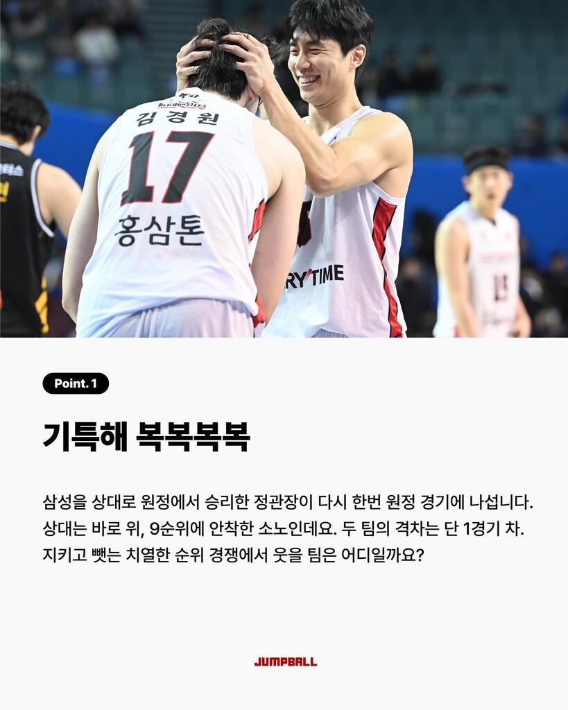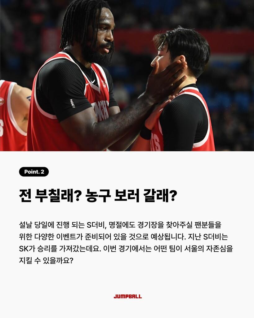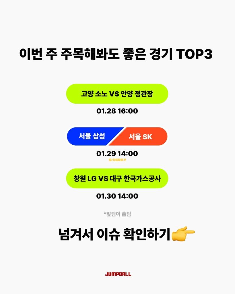 [점프볼=박예승 크리에이터] 설 명절 기간에도 농구는 계속됩니다! S더비부터 3연승을 기대하는 정관장까지! 주목할 이슈가 참 많은데요! 크블췌크를 통해 주목할 경기들을 살펴보시죠!