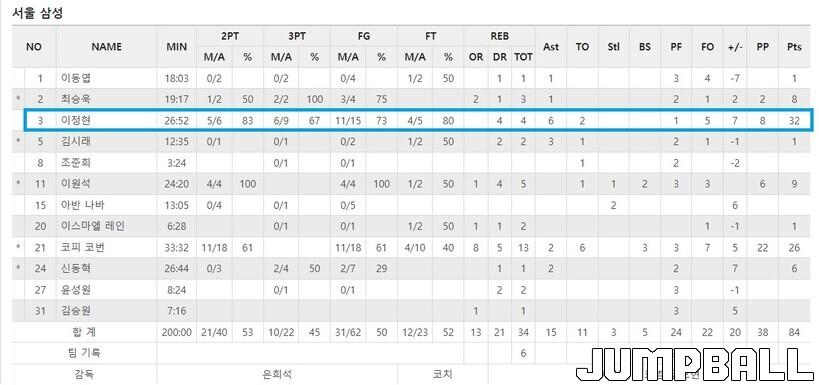 26점 13리바운드를 기록한 코피 코번보다 6칸 위에 있는 기록에 눈에 띈다. 3점슛 6개(성공률 67%) 포함, 32점. 정상급 외인 스코어러를 연상케하는 기록의 주인공은 이정현이다. 최근 '외인공격몰아주기'가 유행이 된 리그 판도에서 국내선수의 32점이었기에 더 눈길을 끌었다. 자신의 1경기 최다득점(35점)에 딱 3점슛 1개 모자란 기록이다.