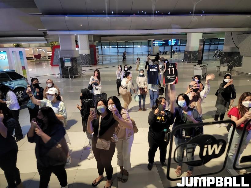 7시간의 비행을 거쳐 도착한 자카르타에는 인도네시아 현지 팬들이 한국 선수들의 유니폼을 들면서 공항까지 마중나와 환영하는 모습을 보였다. 그 모습을 본 선수들이 팬들과 사진을 찍어주며 팬서비스로 화답했다. 여담으로 자카르타 행에 남자 아이돌 그룹 더보이즈와 같은 비행기를 탔지만 인천공항부터 자카르타 공항까지 두 공항 모두 남자농구대표팀 팬들이 더 많게 느껴졌다. 물론 기자 개인적인 느낌이다.