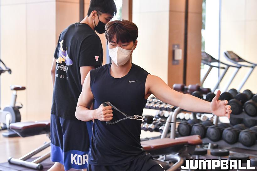 식사를 마치고 대표팀 선수들은 호텔 피트니스 시설에서 웨이트 훈련을 가졌다. 인도네시아가 현재 예전 한국의 코로나 방역 시스템처럼 실내 인원에 제한을 둬 웨이트장에 트레이너와 선수를 포함해서 10명을 넘을 수 없게 되어 있다. 이에따라 대표팀은 선수 6명씩 2번에 나눠서 웨이트 훈련을 진행했다. 호텔 직원들은 수시로 웨이트 장에 찾아와 계속해서 인원 숫자를 세며 확인했다. 각 나라별로 웨이트 장의 대여 시간을 정했기에 한국 대표팀이 웨이트 장을 사용 중일 때 호주 대표팀은 야외 루프 공원에서 둥글게 모여 스트레칭을 펼치고 있었다.