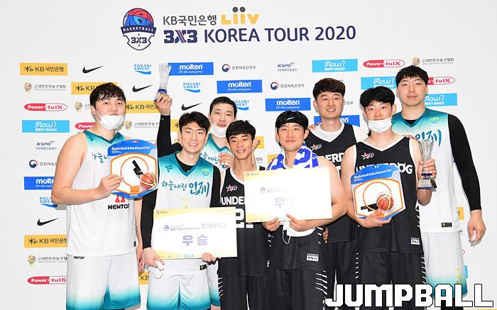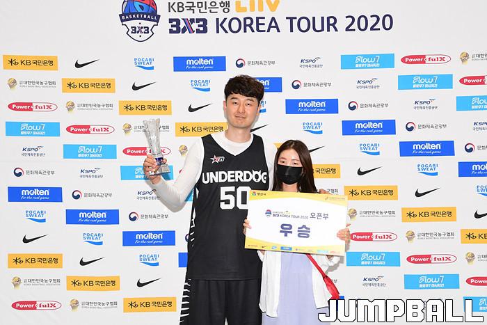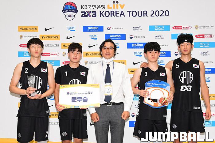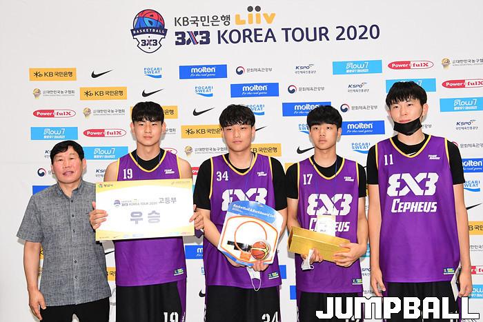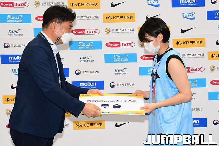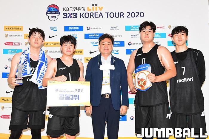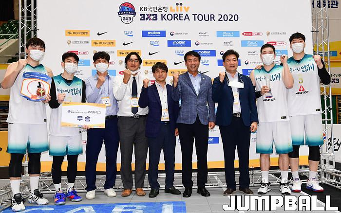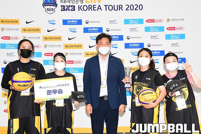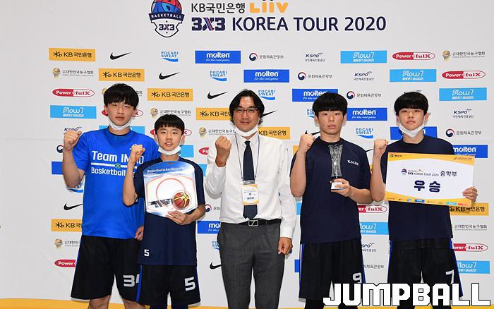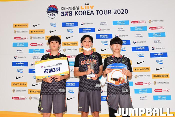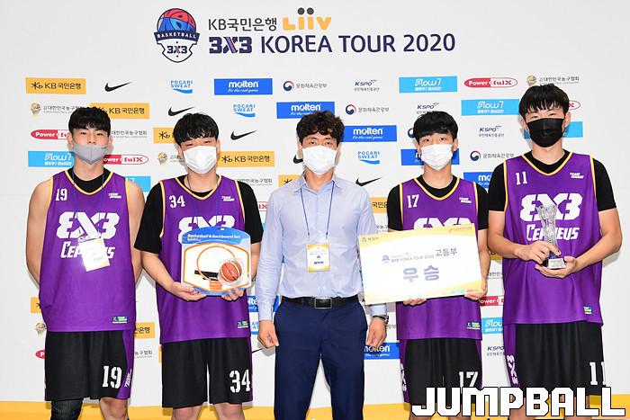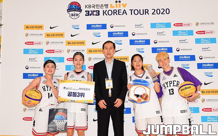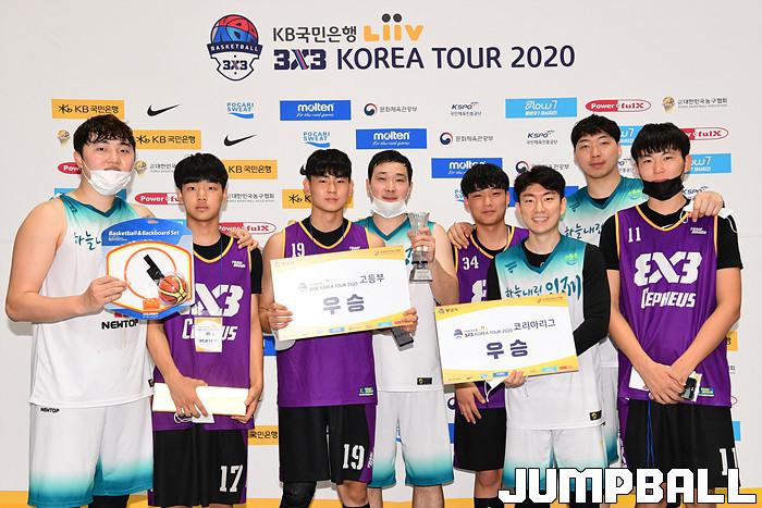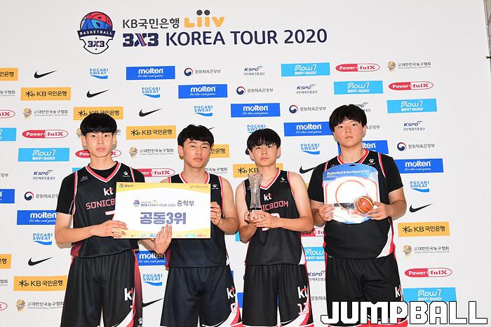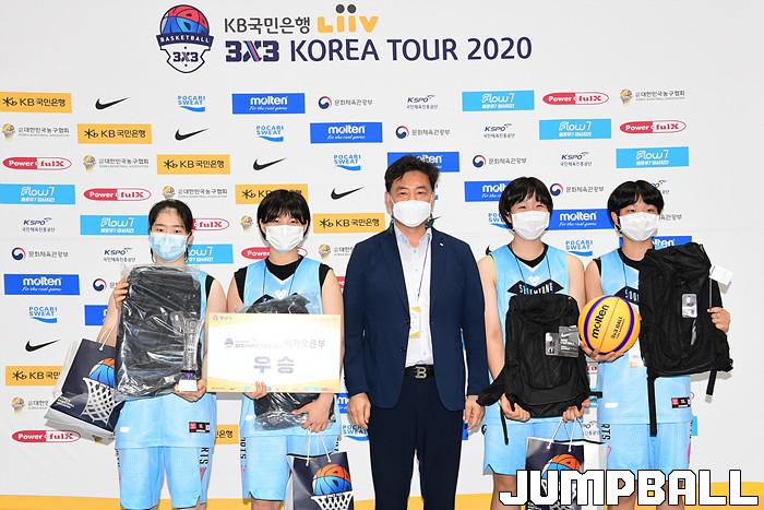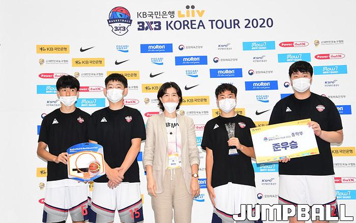 [점프볼=양산/박상혁 기자] 26일 양산실내체육관에서 열린 'KB국민은행 LiiV 3X3 코리아투어 2020 양산대회' 2일차 경기, 중등부에서는 Playing모그, 고등부에서는 케페우스, 여자오픈부에서는 숙명여중, 남자오픈부에서는 언더독, 코리아리그에서는 하늘내린인제가 우승을 차지하였다. 코리아투어 2020 양산대회 시상식 화보