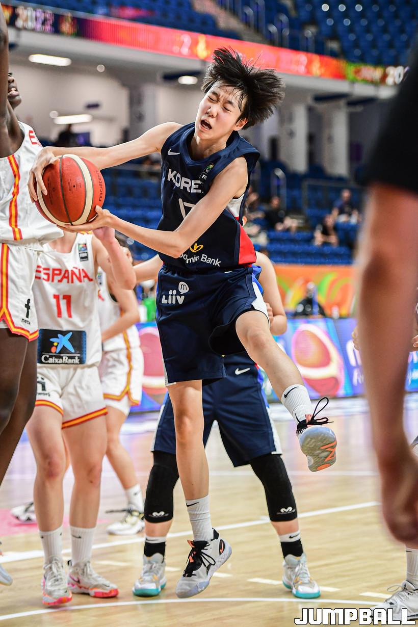 12일 헝가리 데브레첸 포믹스 아레나에서 열린 FIBA U17 여자농구 월드컵 한국과 스페인의 경기, U17 여자농구 대표팀 고현지가 리바운드를 잡아내고 있다.