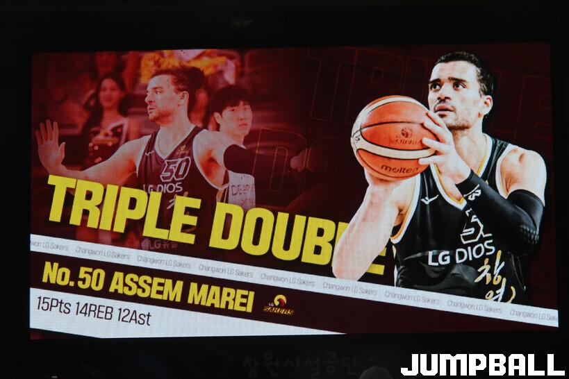 아셈 마레이는 20일 창원체육관에서 열린 2024~2025 KCC 프로농구 원주 DB와 홈 경기에서 15점 14리바운드 12어시스트 5스틸로 개인 통산 첫 트리플더블을 작성하며 창원 LG가 81-68로 승리하는데 앞장섰다.