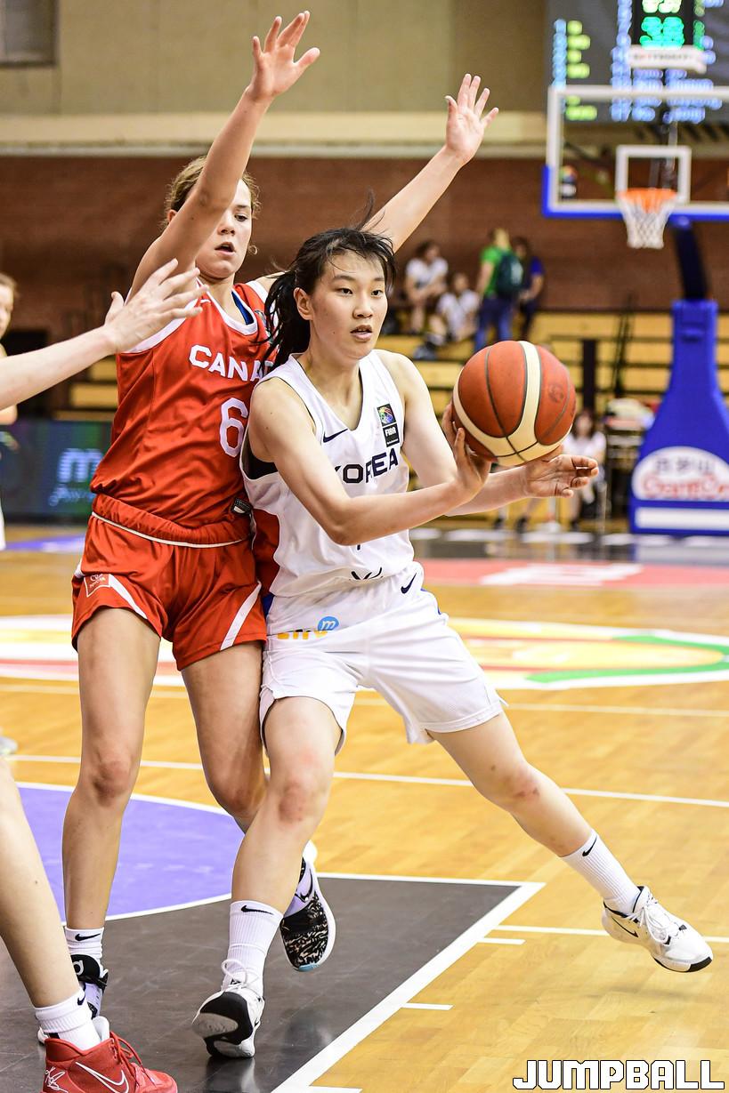 10일 헝가리 데브레첸 올라 가보 스포츠홀에서 열린 2022 FIBA U17 여자농구 월드컵 캐나다와의 조별 리그 2차전 경기, U17 여자농구 대표팀 정현이 골밑까지 들어가 패스를 시도하고 있다.