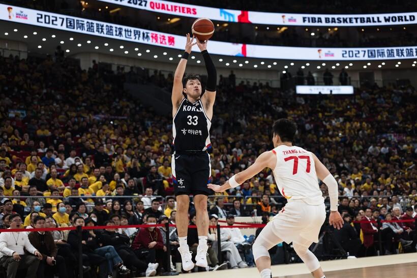 | ▲베이징 우커송아레나에서 슛을 던지는 이승현. 뒤 배경만 봐도 체육관 규모가 엄청나다는것을 알 수 있다.(사진=FIBA) |