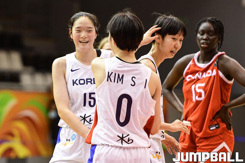 10일 헝가리 데브레첸 올라 가보 스포츠홀에서 열린 2022 FIBA U17 여자농구 월드컵 캐나다와의 조별 리그 2차전 경기, U17 여자농구 대표팀 서진영과 김수인이 고현지의 플레이에 환호하고 있다.