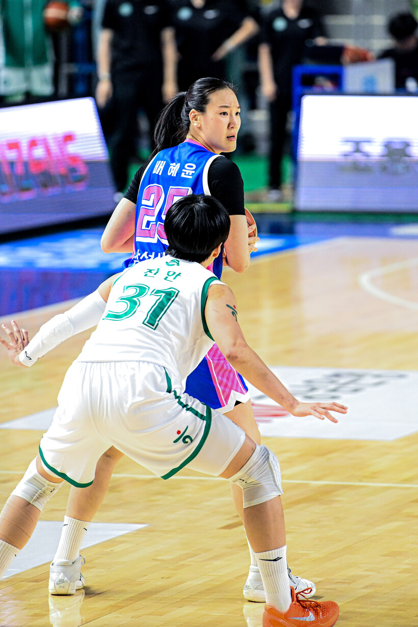 연장에 돌입한 뒤 팽팽하게 맞선 66-66 상황, 배혜윤은 골밑에서 두 차례 결정적인 득점으로 4점의 리드를 만들었다. 팀 득점은 멈췄지만, 삼성생명은 끝까지 승리를 지켰다. 경기 내내 진안을 막아낸 배혜윤도 수비에서 힘을 보탰다.