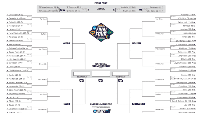 - 지난해 준우승 팀 곤자가 대학교가 이번에는 1번 시드 4학교 곤자가, 애리조나, 캔사스, 베일러 중에서도 가장 높은 순위로 자신들이 선호하는 서부 지구에 배정되었다. 이렇게 되면 64강과 32강전은 포틀랜드의 모다 센터에서, 16강과 8강전은 샌프란시스코의 체이스 아레나에서 치르게 되어 편할 수 있다.