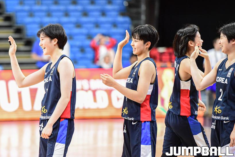 9일 헝가리 데브레첸 포닉스 아레나에서 열린 2022 FIBA U17 여자농구월드컵 한국과 이집트의 경기, 한국 선수단이 하이파이브를 하고 있다.