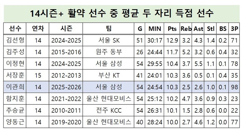 참고로 7명은 14번째 시즌에서 두 자리 득점을 올렸지만, 서장훈만 15번째 시즌에서 두 자리 득점 기록을 남겼다.