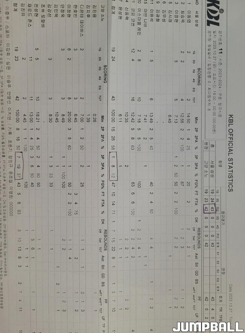 *삼성-소노 전 전반전 기록지. 소노는 평소보다 좋은 확률로 3점슛을 넣고도 3점슛 단 1개 넣은 삼성을 앞서지 못했다.