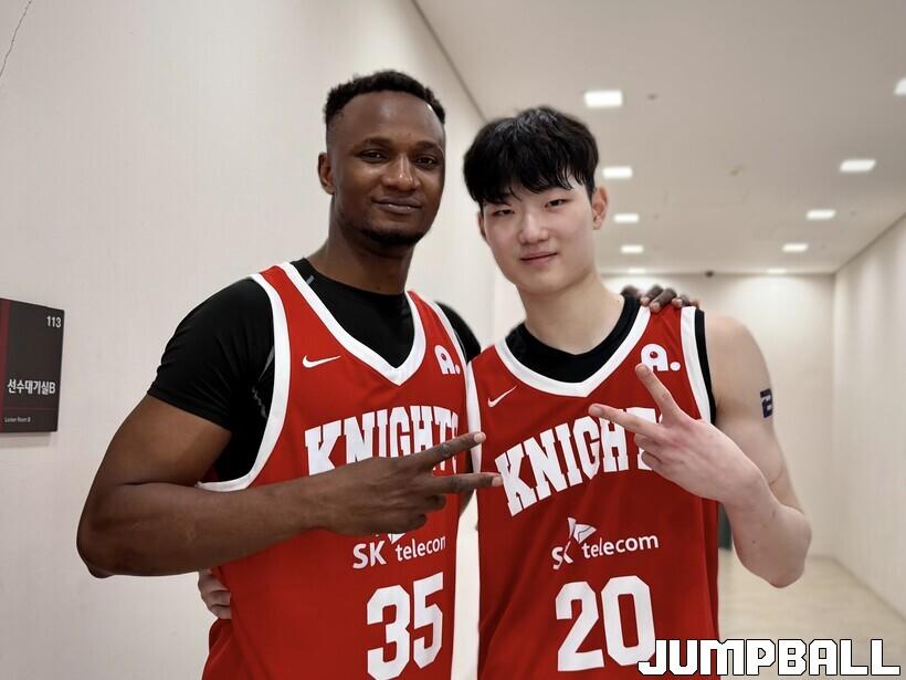 이날 경기 전 눈에 띈 장면은 휘문고 출신인 SK 김명진(199cm, F)과 프레디(202cm, C)의 친근한 분위기였다. 둘은 휘문고 시절 김명진의 유급으로 1년 선후배 관계지만 실제로는 같은 '2003년생' 동갑내기다. 이날 웜업과 벤치에서도 서로 웃으며 찐친 모습이 포착됐다.