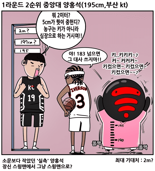 양홍석은 맨발로 196cm라고 주장했으나 측정시에는 어떻게 재도 195cm가 최대치였다. 신장이 공개되기 무섭게 실망의 목소리도 흘러나오는 분위기였다. 양홍석의 최대 장점 중 하나인 장신 포워드로서의 가치가 다소 희색될 수 있기 때문이었다. 하지만 kt는 흔들리지 않았다. 아니 당연한 수순이었는지도 모른다.