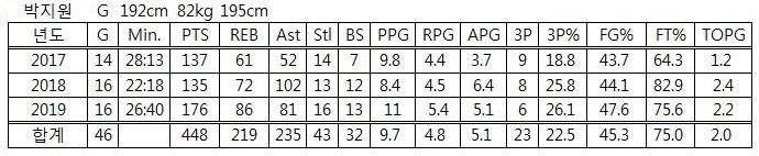 박지원은 대학농구리그 46경기에 출전했다. 이 중 3점슛을 2개 이상 성공한 건 5경기이고, 블록을 2개 이상 기록한 건 8경기다. 평균 3점슛 성공은 0.5개, 평균 블록은 0.7개다. 가드임에도 블록 능력이 뛰어나다고 볼 수 있지만, 3점슛이 약한 선수라는 평가도 가능하다. 기록이 그렇게 말하고 있다. 실제로 대학농구리그 통산 3점슛 성공률은 22.5%(23/102)다. 스카우트들도 박지원 이름이 나오면 “슛이 약하다”고 공통적으로 말한다.
