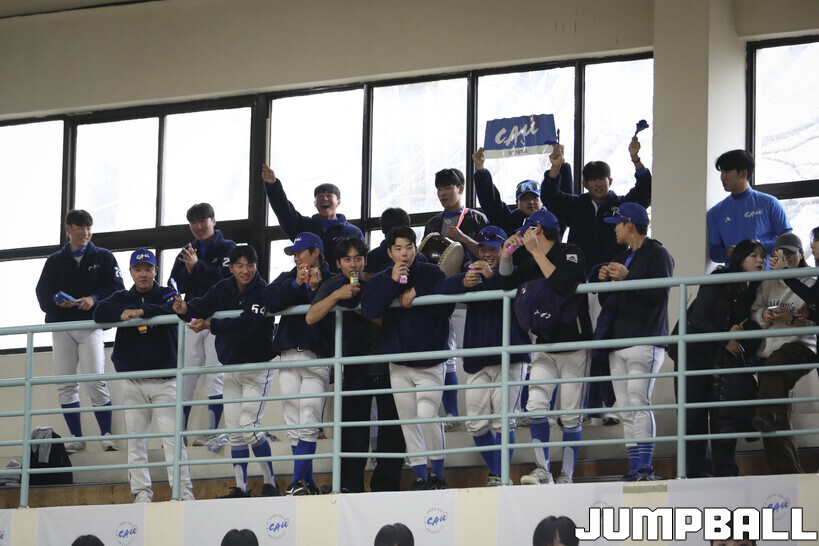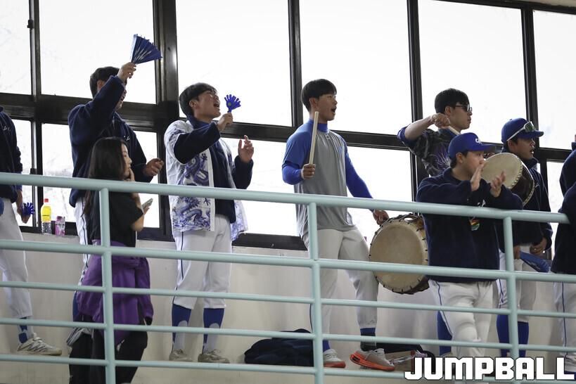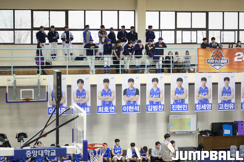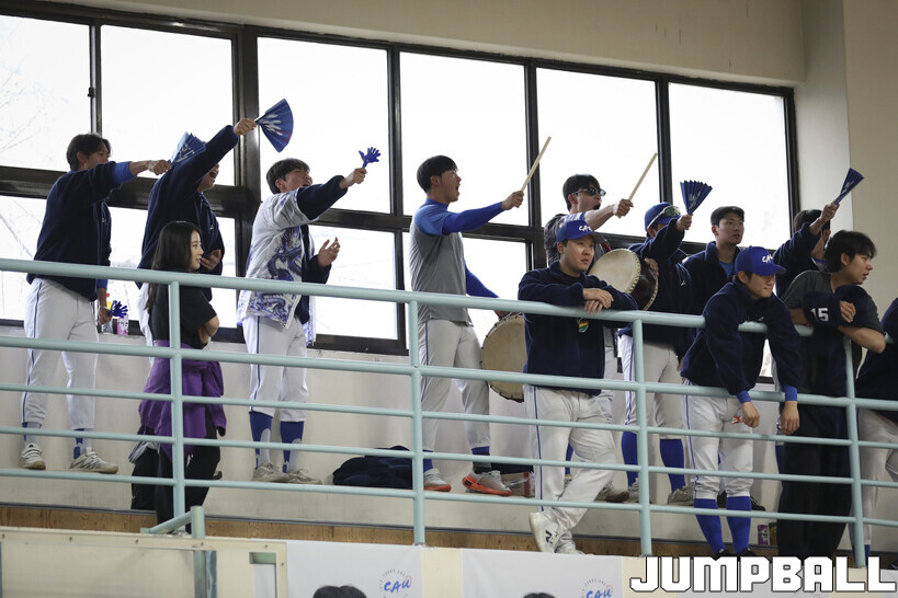 보통 대학리그 체육관의 관중석을 채우는 인원은 수업 후 농구부를 응원하고자 방문한 이들이 다수다. 그러나 청룡체육관은 다르다. 아예 응원단장, 치어리더를 자처하려는 인원들의 목소리가 쩌렁쩌렁 울려퍼진다. 주인공은 바로 중앙대 야구부.