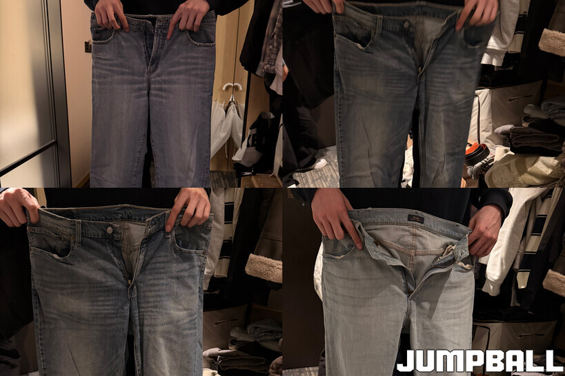 사진은 예쁘게 남길 자신이 없어 포기했다. 청바지 자랑이 끝난 뒤 눈에 밟힌 건 위 사진에서 4번째 바지다. 강지훈에게도 허리가 크다는 이 바지는, 실물로 보니 취재진이 이불로 덮어도 될 것 같은 크기였다. “청바지를 진짜 좋아해요. 제가 좋아하는 청자켓도 숙소에 둘 예정이에요.” 역시 청지훈.