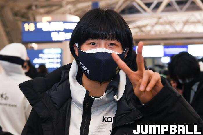 7일 정선민 감독과 최윤아 코치가 이끄는 한국 여자농구 대표팀이 2022 FIBA 여자농구 월드컵 최종예선이 열리는 세르비아 베오그라드로 출국했다. 이해란이 승리의 V 포즈를 하고 있다.