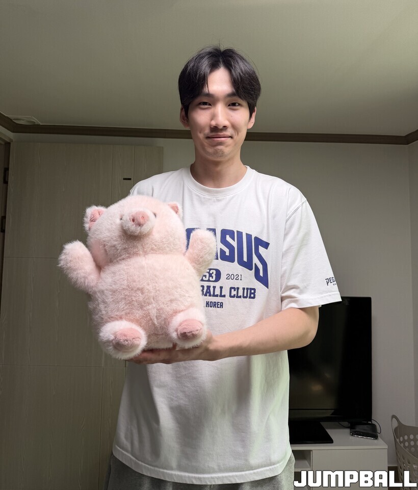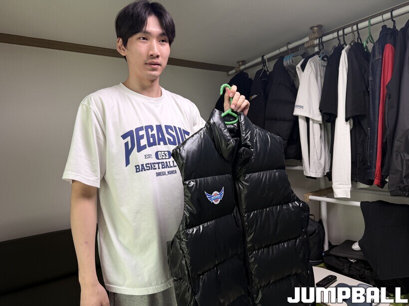 후드집업, 후드티, 맨투맨까지… 패션 철학을 느끼게 하던 옷들이 연속함수 마냥 나오던 시점. 취재진과 김민규의 폭소를 자아내는 한 컷이 연출되었다. 페가수스 반팔티, 페가수스 반팔티.. 몇 장을 받은 건지 셀 수 없을 정도로 많은 가스공사 구단의 반팔티가 걸려 있었다. “대구가 느끼셨다시피 3월에도 낮에 굉장히 더워요. 그렇다 보니 구단에서 주신 이 반팔티를 몇 벌씩을 챙기게 됩니다. (지금도 입고 계시네요) 앗! 그렇네요(웃음).”