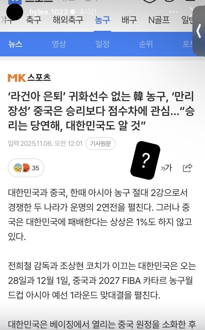 이현중은 중국전을 앞두고 열세라는 평가에 자극을 많이 받은 듯했다. 경기 종료 후 개인 소셜미디어를 통해서는 중국 언론의 주장이 담긴 한 기사를 캡처, 물음표로 맞불을 놓았다.