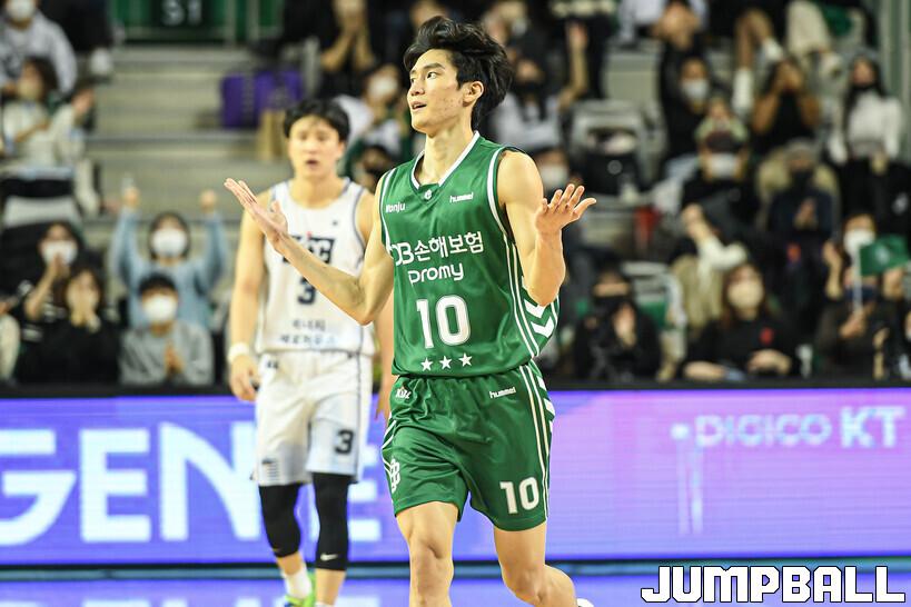 31일 원주종합체육관에서 열린 2022-2023 SKT 에이닷 프로농구 원주 DB와 전주 KCC의 경기, DB 정호영이 3점슛을 성공시킨후 세레머니를 하고 있다.