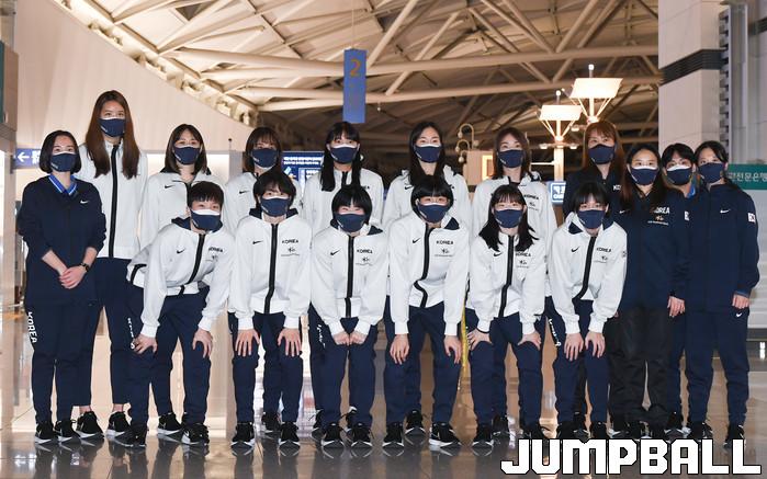 7일 정선민 감독과 최윤아 코치가 이끄는 한국 여자농구 대표팀이 2022 FIBA 여자농구 월드컵 최종예선이 열리는 세르비아 베오그라드로 출국했다. 대표팀이 비행기에 오르기 전 단체 사진 촬영을 하고 있다.
