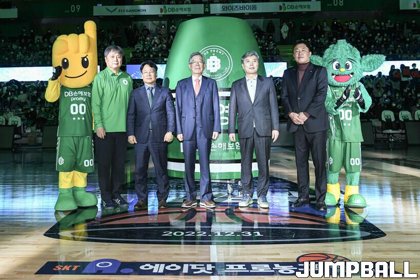 31일 원주종합체육관에서 열린 2022-2023 SKT 에이닷 프로농구 원주 DB와 전주 KCC의 경기, DB가 KCC에 102-90으로 승리하며 농구영신을 승리로 장식했다. KBL 김희옥 총재와 DB 권순철 단장, KCC 최형길 단장, DB 이상범 감독, KCC 전창진 감독이 타종식을 마치고 기념 촬영시간을 가졌다.