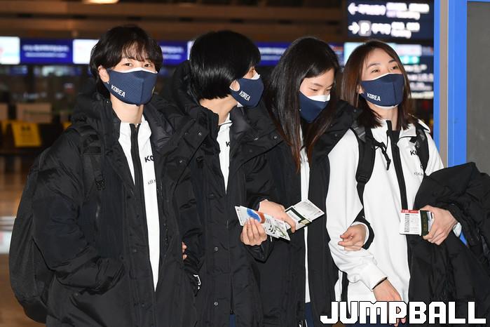 7일 정선민 감독과 최윤아 코치가 이끄는 한국 여자농구 대표팀이 2022 FIBA 여자농구 월드컵 최종예선이 열리는 세르비아 베오그라드로 출국했다. 배혜윤, 박혜진, 윤예빈, 이해란이 사이좋게 옆사람의 팔을 잡고 출국장으로 들어가고 있다.