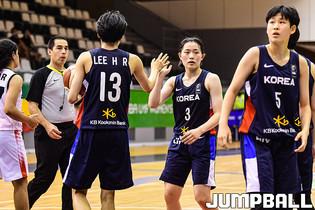 14일 헝가리 데브레첸 올라 가보르 스포츠홀에서 열린 '2021 FIBA U19 여자농구월드컵' 한국과 아르헨티나의 순위결정전 경기, 조수아가 변소정과 하이파이브를 하고 있다.
