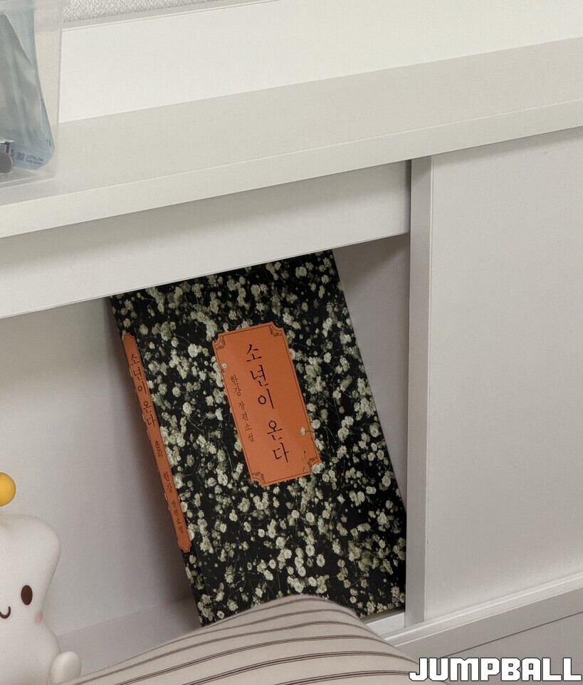 “이것은 좀 심혈을 기울였어요. 좋은 것을 고르고 싶어서 두 개 다 해서 80만 원 정도 주고 샀습니다. 잠은 잘 자야 하니까요(웃음).” 침대 프레임을 보며 구매 정보를 공유하고 있을 때, 머리맡에 놓여있던 수상한 물체 하나가 눈에 들어왔다. 다름 아닌 한강 작가의 장편소설 ‘소년이 온다’. 곧바로 질문을 던졌다. “흠… 저 책은 연출용인가요?”