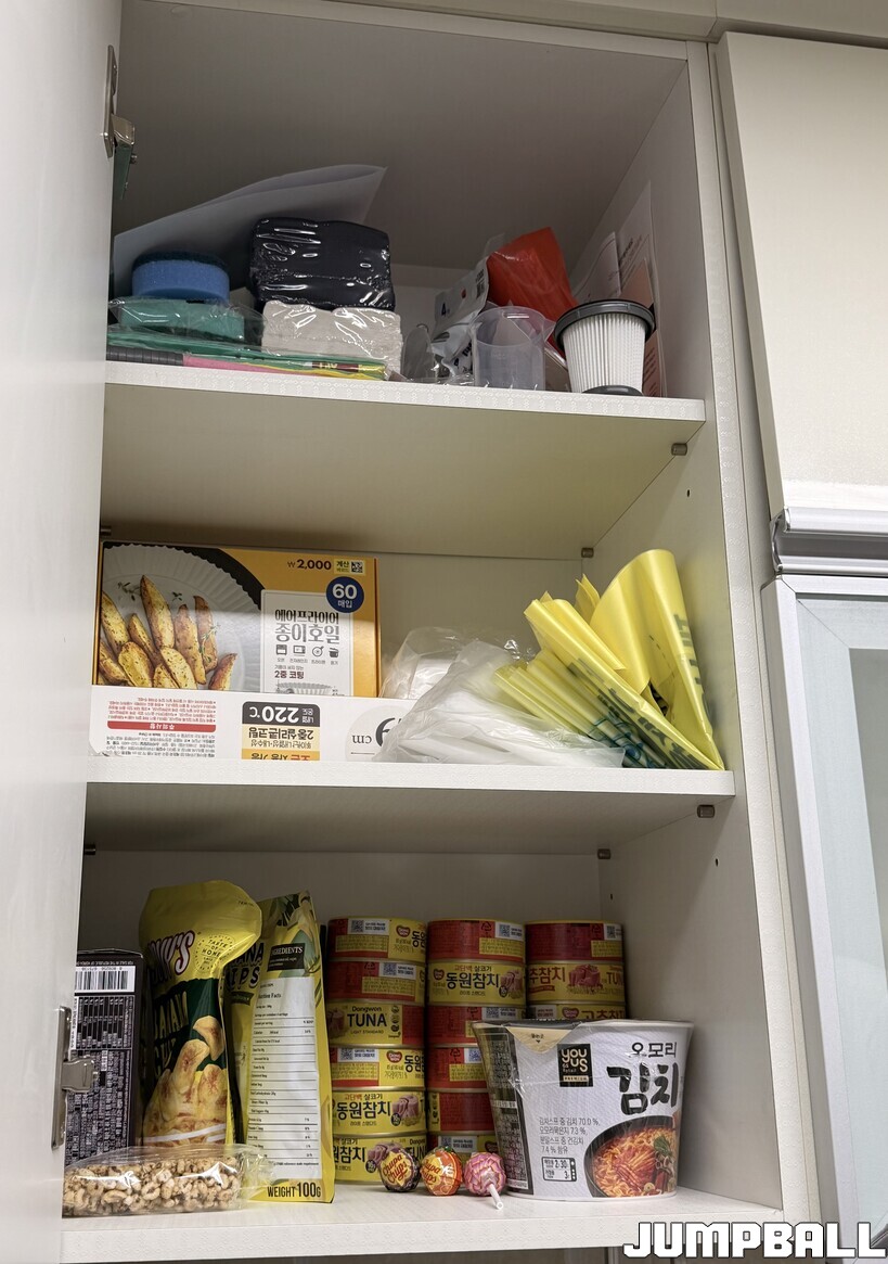 데스크탑만 오면 완성되는 침실까지 둘러보았고, 김민규는 마지막으로 소개하고 싶은 게 남았다며 주방으로 인도했다. 그런데 이게 웬걸. 김민규의 수납함과 주방에서 낯익은 공기가 느껴졌다. 수많은 통조림과 라면, 호일, 종량제 쓰레기 봉투, 키친타월에 다이소에서 구매한 흔적이 보이는 이것저것. 자취생 국룰템들이 한 눈에 들어왔다. 게다가 결승 득점은 콜라 몇 캔만이 들어있는 냉장고에서 터졌다.