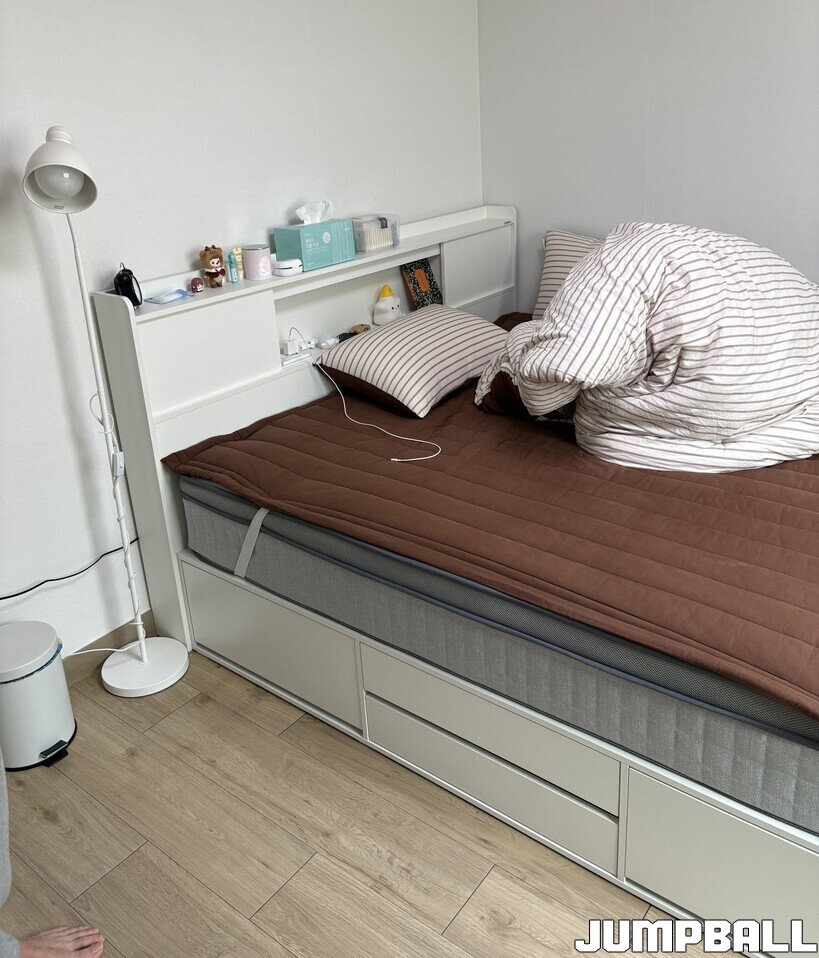 투룸의 마지막 방은 그의 침실. 무드등을 비롯해 보기만 해도 눕고 싶은 매트리스와 수납공간이 가득한 침대 프레임까지.