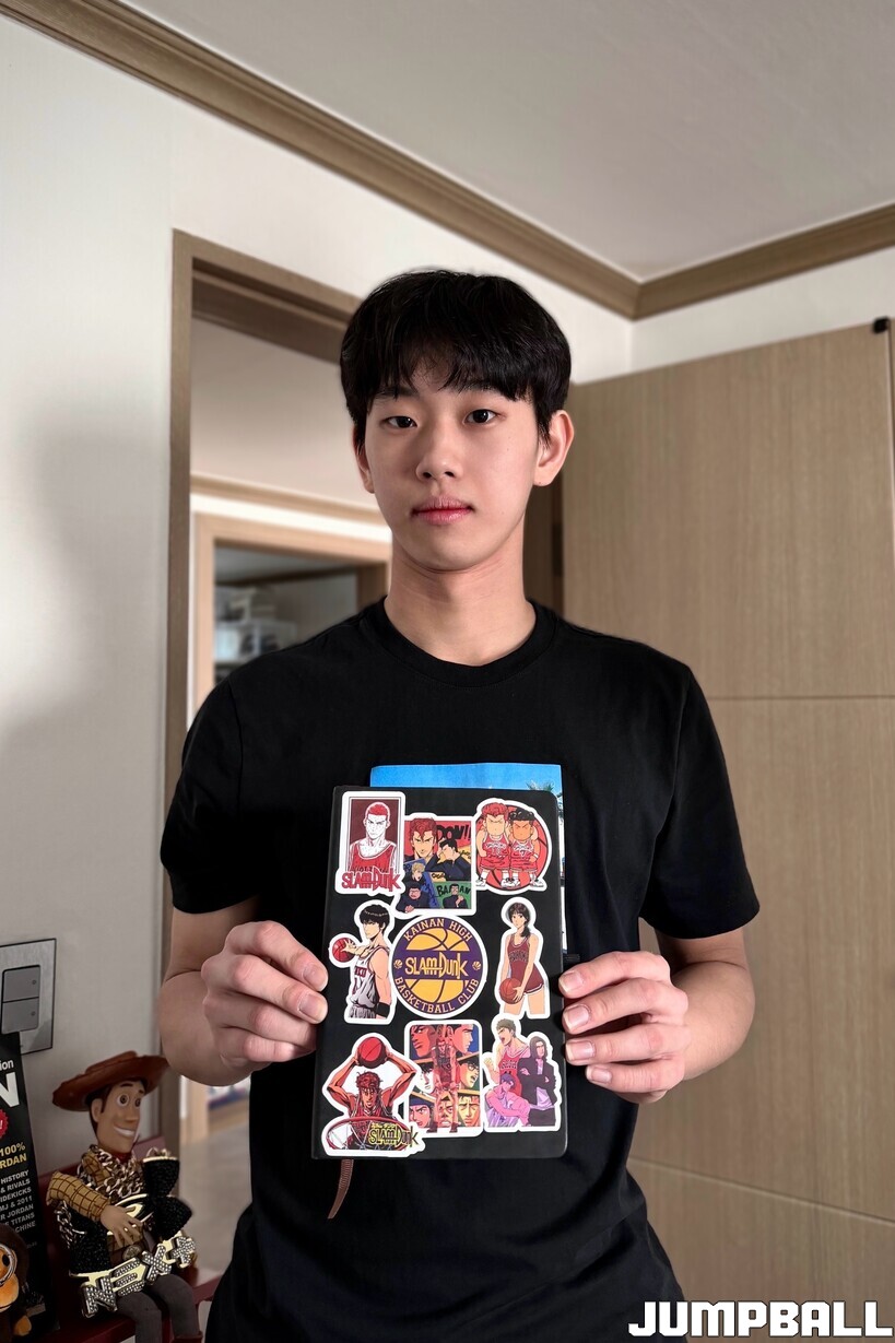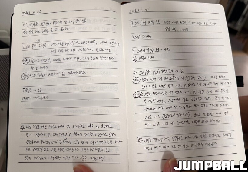 "이 다이어리는 슬램덩크 스티커로 제가 직접 꾸몄어요. 농구 관련 일지를 쓰는 다이어리인데, 경기 전과 후에 기록하는 편이에요. 맞대결을 앞둔 경기 전에도 읽고 더 쓰고 해요."