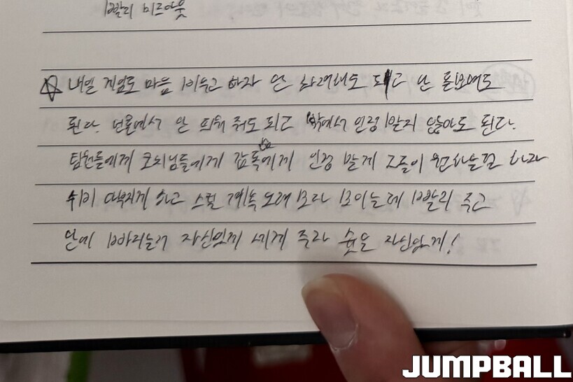 ‘☆내일 게임도 마음 비우고 하자. 안 화려해도 되고 안 돋보여도 된다. 언론에서 안 띄워줘도 되고 밖에서 인정받지 않아도 된다. 팀원들에게, 코치님들에게, 감독님에게 인정받게 그들이 원하는 걸 하자. 수비 다부지게 하고 스틸 계속 노려보자. 보이는 데 빨리 주고, 안에 빠지는 거 자신 있게 세게 주자. 슛은 자신 있게!’