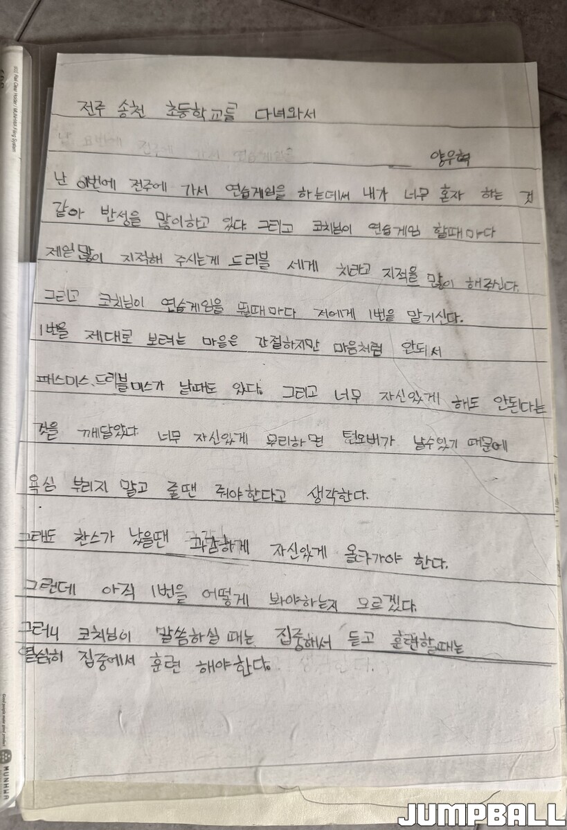 그만큼 하고 싶은 것들이 많다. 그래서 선택지도 다양하다. 그중 영어 공부는 짧아도 일상처럼 굳어졌고, 훈련과 경기가 끝난 밤에는 농구일지로 하루를 갈무리한다.