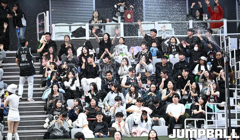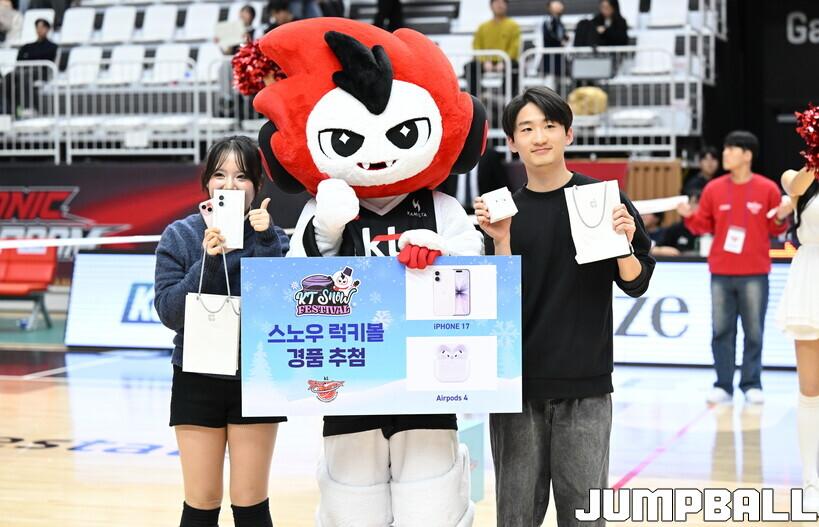 응원단도 슈팅건을 통해 공 모양의 모형 눈을 관중들에게 발사했다. 단순한 모형 눈이 아닌 행운이 가득 담긴 럭키볼이었다. 모형 눈마다 고유의 숫자가 새겨져 있었고, KT는 경기 종료 후 수훈선수로 선정된 아이재아 힉스가 직접 추첨에 나서 팬들에게 선물을 전달했다. 힉스가 뽑은 2명의 팬에게는 각각 아이폰17, 에어팟 4세대가 제공됐다. KT 선수가 3점슛을 터뜨리면 관중석에서 어느 때보다 큰 함성이 터져 나온 이유였다.