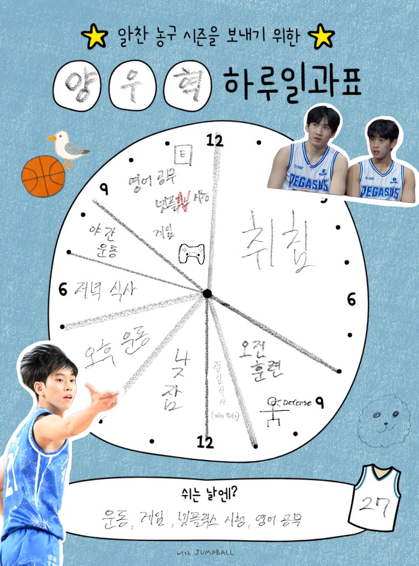 그렇게 생활의 틀이 어느 정도 자리를 잡은 가운데, 양우혁은 코트 안팎에서 자신만의 하루를 채워가고 있었다. 다음은 알찬 시즌을 보내기 위한 양우혁의 일과표다.