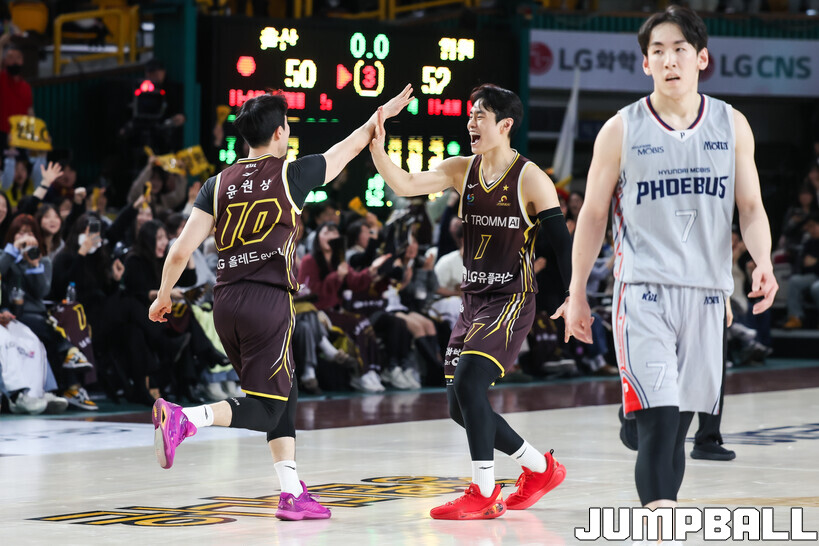 윤원상이 유기상의 인바운드 패스를 받자마자 3점슛을 던졌는데 그대로 림을 통과했다. 3점슛 버저비터였다.