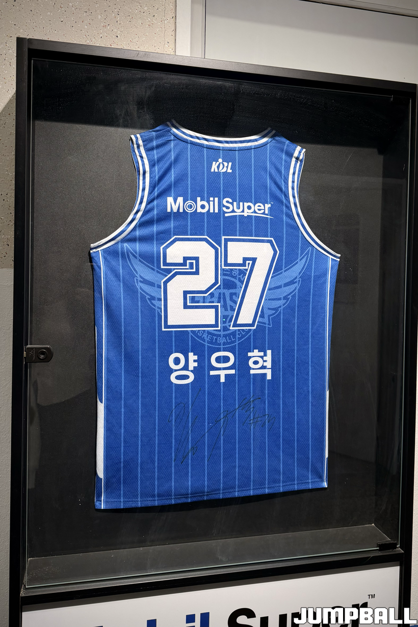 “이 유니폼은 목걸이 받았던 IMG에서 입은 유니폼이에요. 이때도 27번이었네요(웃음). 가스공사에서 등번호를 고른 건 이것 때문은 아니고 그냥 란겔이 형 좋아해서 골랐습니다. 이때는 랜덤이었어요. 또 이렇게 연결이 되네요.”