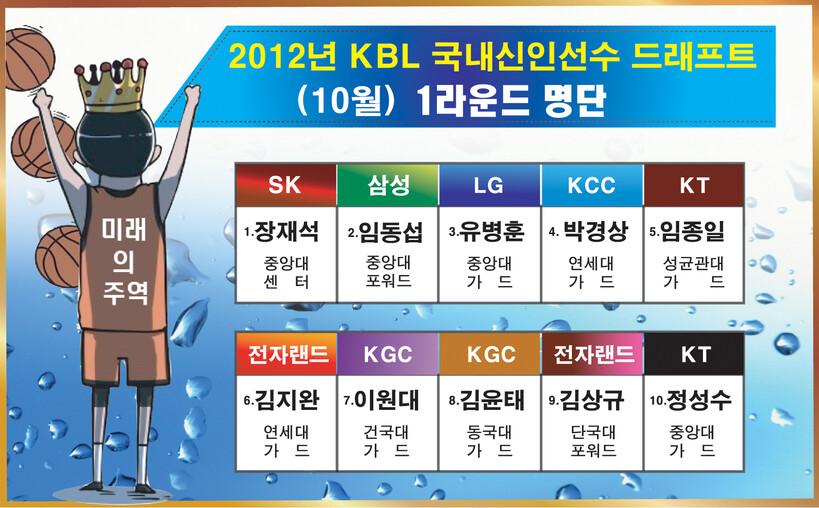 1월 드래프트가 김시래, 최부경이라는 확실한 선수들을 배출한데 비해 10월 드래프트는 전체적으로는 좋지만 누구하나 각팀의 간판선수로 큰 선수가 없다. 일단 그동안 주춤하던 중앙대의 약진이 눈에 띄었다. 1~3순위 장재석, 임동섭, 유병훈을 비롯 10순위 정성수, 2라운드 3순위 김현수까지 총 5명이 지명됐다.
