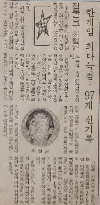 다행히(?) 최철권은 자신만의 확실한 기록을 하나 가지고 있다. 1987년 전국체전에서 전북 대표로 출전해 한경기 최다 97득점을 넣으며 지금도 깨지지 않는 득점 기록을 만들어낸 것이다. 당시 상대 팀이던 부산 선발이 기록한 95득점보다 더 많은 득점으로, 마치 고대 괴수의 기록을 보는 듯 하다. 97득점은 소위 밀어준다고 해서 만들어질 수 있는 득점이 아니다. 더욱이 당시 경기는 각 도의 자존심을 걸고 승부를 펼친 전국체전이었다. 최철권이 과소평가됐다는 평가가 과장이 아님을 확실하게 확인할 수 있는 경기였다.