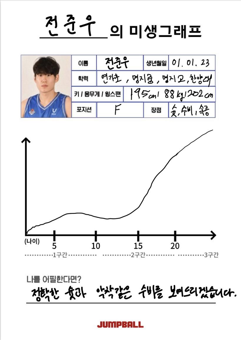 “어느 팀을 가더라도 진짜 수비를 악착같이 할 수 있다는 생각을 해요. 그리고 찬스가 나면 3점슛을 정확하게 넣을 자신 있어요. 그리고 감독님이 의지하는 선수가 되고 싶어요. 믿고 기용하는 선수가 제 목표입니다”라는 목표를 밝힌 전준우다.