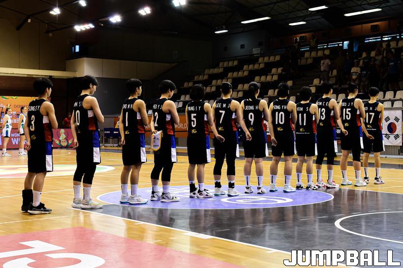15일 헝가리 데브레첸 올라 가보 스포츠홀에서 열린 2022 FIBA U17 여자농구월드컵 한국과 슬로베니아의 순위 결정전 경기, U17 여자농구대표팀이 경기 시작 전 국민의례를 하고 있다.