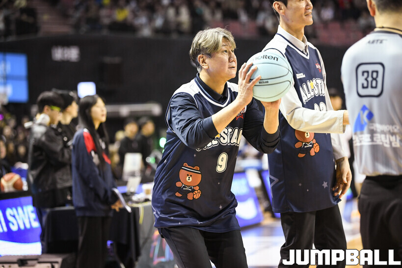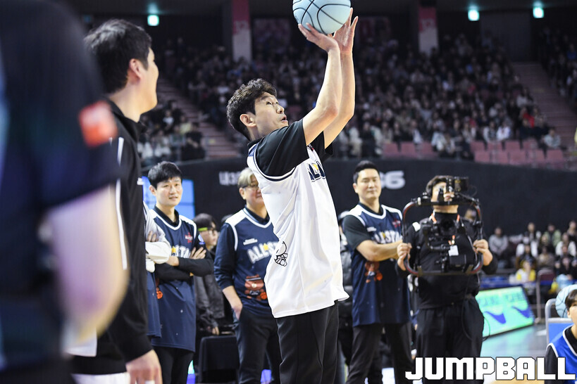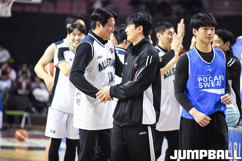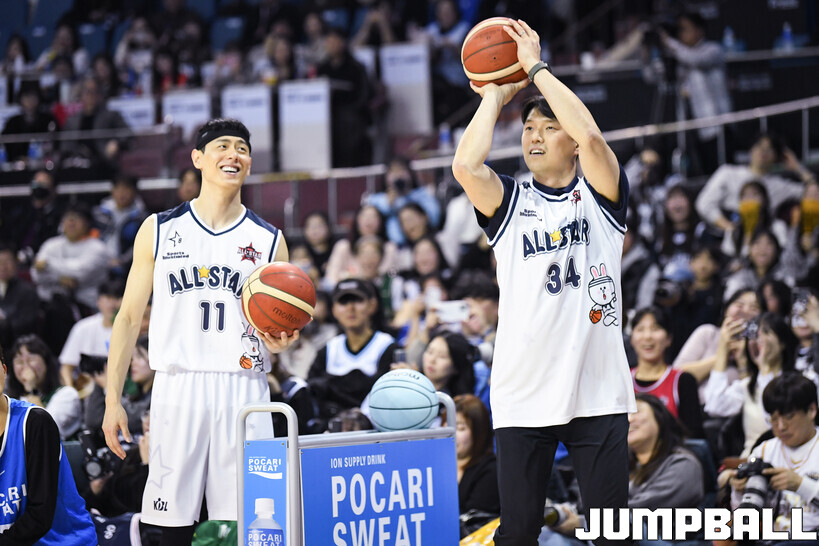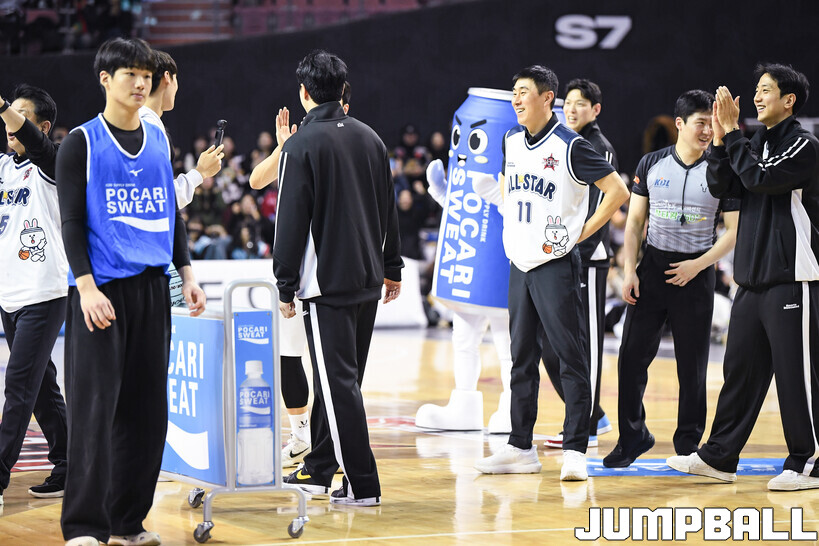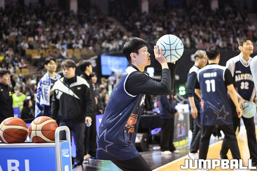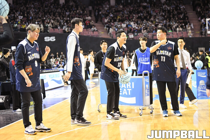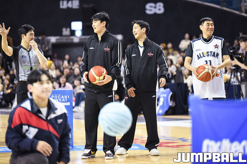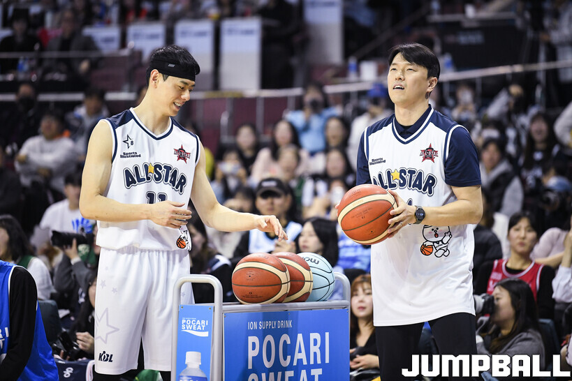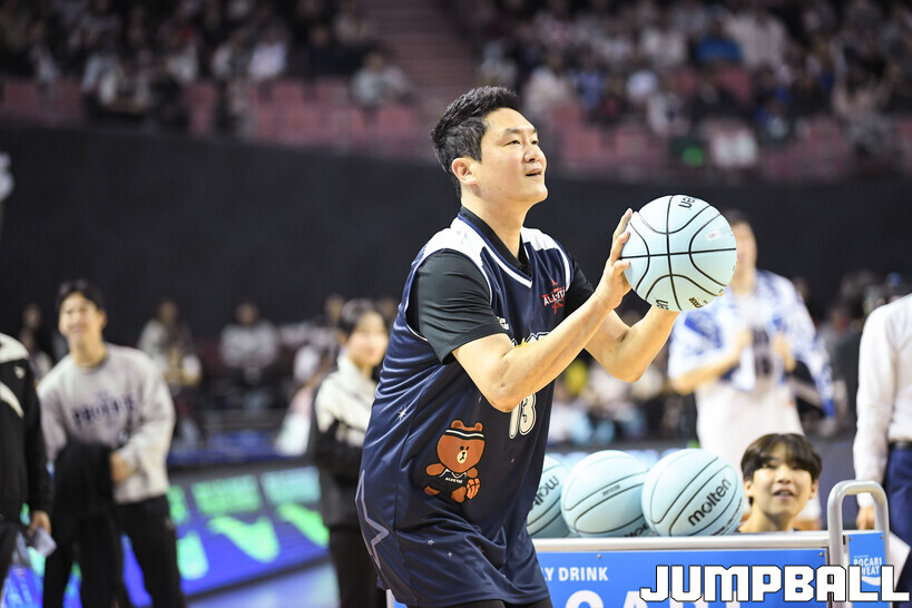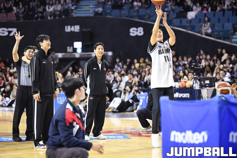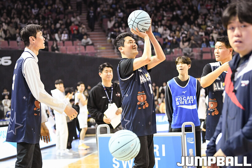 [점프볼=잠실/유용우 기자] 18일 잠실체육관에서 열린 2025-2026 LG전자 프로농구 올스타전 포카리스웨트 3점슛 콘테스트, 본 콘테스트에 앞서 팀 브라운과 팀 코니의 감독, 코치의 이벤트 3점슛 매치가 열렸다. 현대모비스 양동근 감독과 KT 문경은 감독은 5개 중 4개를 성공시키며 녹슬지 않은 실력을 농구팬들에게 선보였다. 팀 브라운은 삼성 김효범 감독의 머니볼 성공으로 15-14로 이벤트 매치에 승리했다.